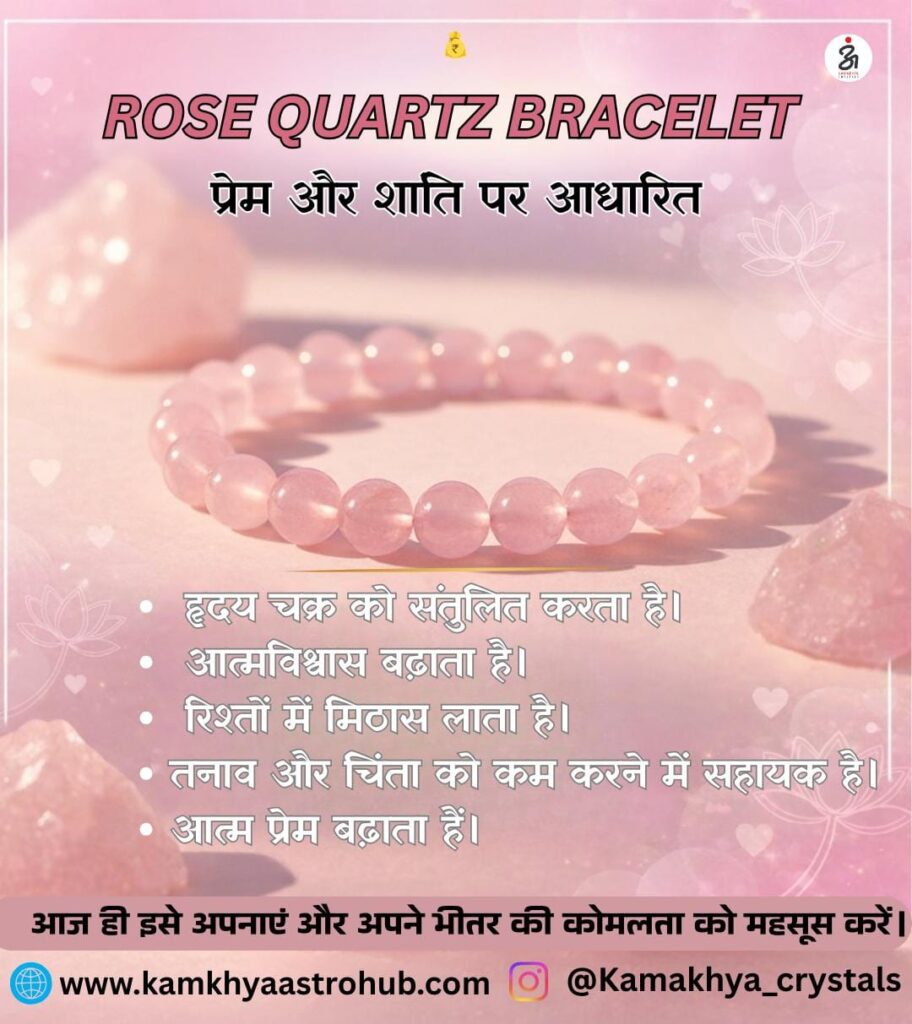 आज की भागदौड़ भरी ज़िंदगी में हर इंसान शांति, प्रेम और मानसिक संतुलन चाहता है। तनाव, चिंता और रिश्तों में खटास आम हो गई है। ऐसे समय में रोज़ क्वार्ट्ज़ (Rose Quartz) एक ऐसा प्राकृतिक रत्न माना जाता है, जो दिल और मन को सुकून देने का काम करता है। रोज़ क्वार्ट्ज़ से बना ब्रेसलेट न सिर्फ़ देखने में खूबसूरत होता है, बल्कि इसके आध्यात्मिक और मानसिक लाभ भी बताए जाते हैं।